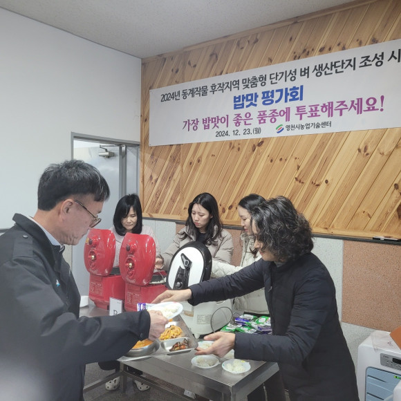 이번 평가회는 금년도 시범사업인 ‘동계작물 후작지역 맞춤형 단기성 벼 생산단지 조성사업’으로 시험 재배한 조생종 벼 3품종(해담, 다평, 밀양395)으로 지은 밥을 시식 후 선호도를 조사하는 방식으로 진행됐다.