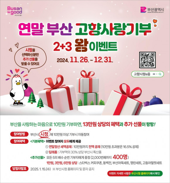 한편, 시는 연말정산을 앞두고 '부산광역시(시청)'에 기부하는 사람들에게 '5가지 혜택'을 제공하는 '연말 부산고향사랑기부 2+3 왕 이벤트'를 진행하고 있다.