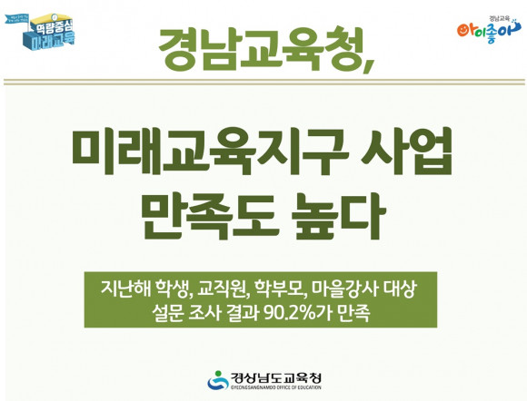 경남교육청은 지난해 11월 25일~12월 23일 미래교육지구 사업에 참여한 학생, 교직원, 학부모, 마을교사를 대상으로 ‘2024년 미래교육지구 운영 만족도 조사’를 온라인으로 진행했다. 응답자 수는 총 4,409명이며 이 가운데 90.2%가 ‘만족한다’라고 응답했다.