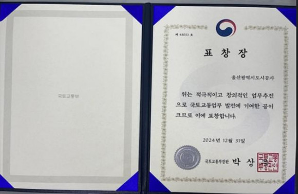이에 울산시는 13일 오후 3시 40분 시청 본관 7층 시장실에서 김두겸울산시장이 윤두환 울산도시공사 사장에게 국토교통부 장관 기관표창을 전수한다고 밝혔다.