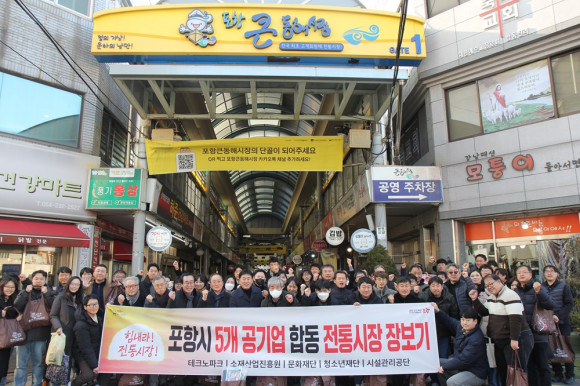 이번 행사는 설 명절을 맞이하여, 고물가와 경기 침체로 어려움을 겪고 있는 지역 상권에 활력을 불어넣기 위해 진행되었으며, 5개 공기업 임직원 80여 명이 참여해, 포항사랑상품권을 홍보하고, 생필품, 제수용품, 명절 선물 등을 구매하며 지역 소비 촉진에 힘을 모았다.