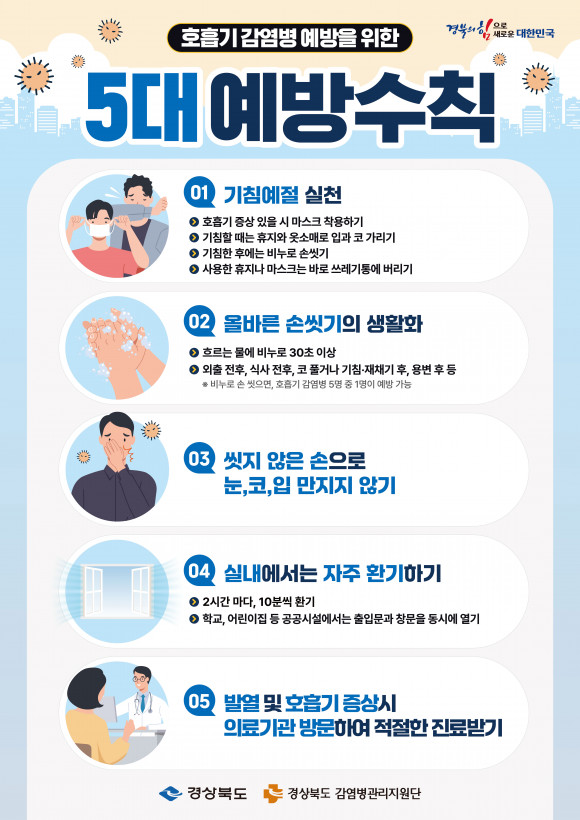 상주시는 임시공휴일 지정으로 길어진 연휴동안 귀성객 등 이동이 많아짐에 따라 호흡기 감염이 빠르게 확산될 가능성이 높아, 다음 5가지 호흡기질환 예방수칙을 준수할 것을 권고했다. ① 외출 전․후 올바른 손씻기 ② 기침예절 실천 ③ 씻지 않은 손으로 눈, 코, 입 만지지 않기 ④ 실내에서는 자주 환기 ④ 발열 및 호흡기 증상시 진료받기