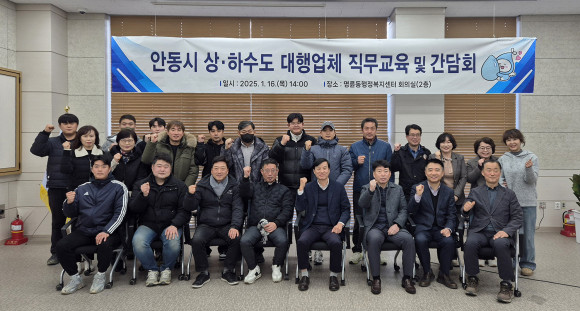|  | | | ⓒ (주)영남도민일보 | | [영남도민일보] 김 진규 기자 = 안동시(시장 권기창)는 1월 16일 명륜동 행정복지센터 2층 회의실에서 상하수도 대행업체 10개 사 대표자 및 실무자와 맑은물사업국 직원 40여 명을 대상으로 직무능력 향상 및 상호협력 강화를 위한 ‘상·하수도대행업체 직무교육 및 간담회’를 개최했다.