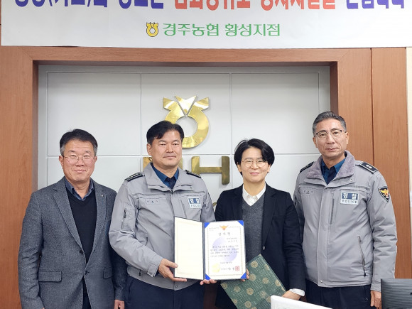 |  | | | ⓒ (주)영남도민일보 | | [영남도민일보] 정 문 용 기자 = 2025년 1월 23일 오전 10시경, 경주농협 황성지점에서 경주경찰서 박봉수 경찰서장이 보이스피싱 사건에서 신속히 대처한 김정은 과장에게 감사장을 수여했다.