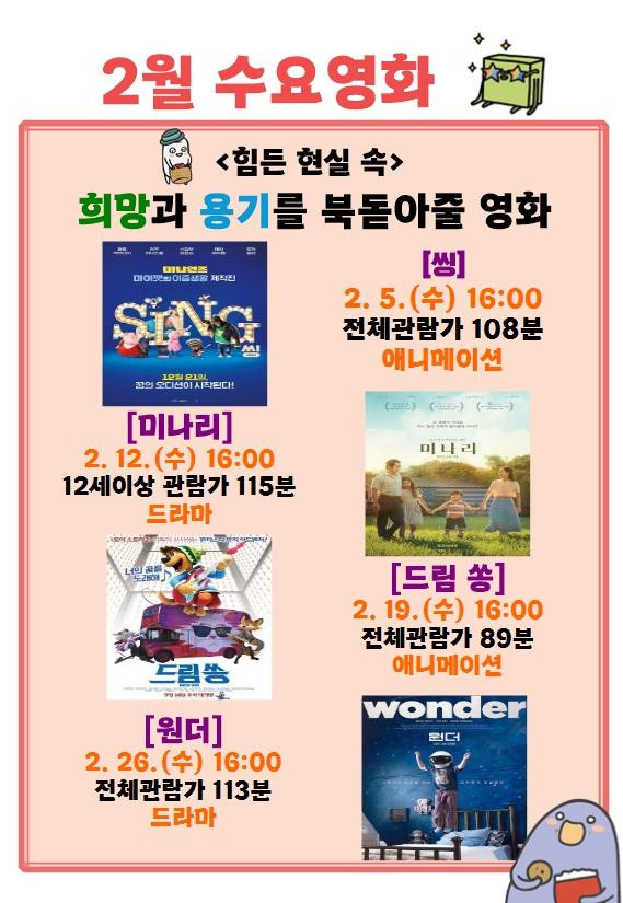 한편 ‘수요영화’는 누구나 무료로 자유롭게 관람할 수 있으며, 매주 수요일 오후 3시 30분부터 선착순 50명에게 입장권이 배부된다.