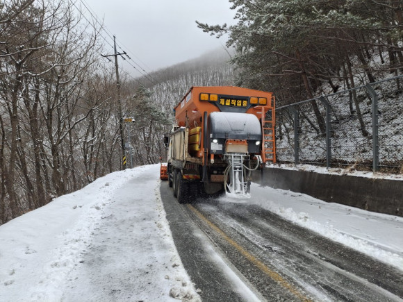 시는 대설주의보가 내려지기 전부터 선제적으로 덤프트럭과 굴삭기, 제설제 등을 투입해 산간 지역, 고갯길 등에 사전 살포를 시작했다.