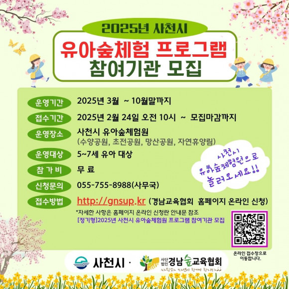 수방법은 경남숲교육협회 홈페이지((http://gnsup.kr)를 통해 2025. 2. 24.부터 신청을 받을 예정이며, 문의 사항은 경남숲교육협회 사무국(☎055-755-8988)으로 연락하면 된다.