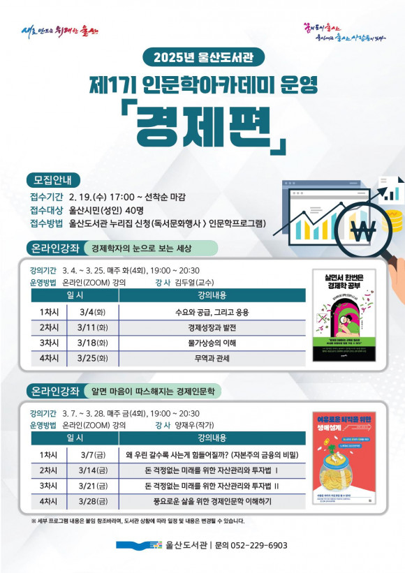 |  | | | ⓒ (주)영남도민일보 | | [영남도민일보] 영남도민일보 기자 = 울산도서관은 오는 3월 4일부터 28일까지 ‘2025년 제1기 인문학 아카데미 경제편’ 강좌를 운영한다고 밝혔다.