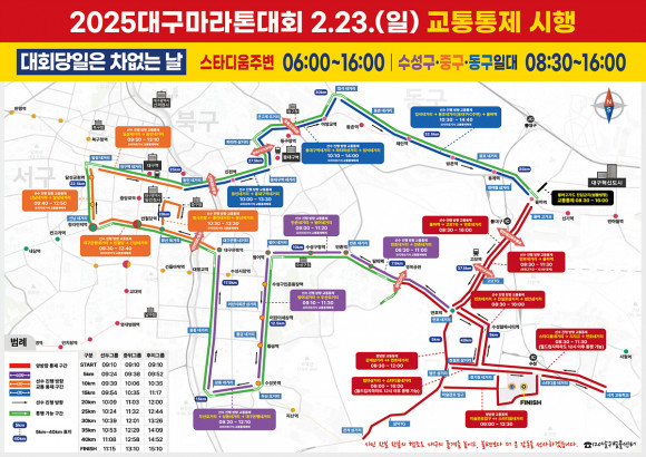 한편, 대구시와 대구경찰청은 대회 준비기간 중 현장답사를 실시하고 교통소통 방안을 논의해 우회도로를 확보하고, 인근 주민 교통통제 사전안내를 실시했으며, 대회 당일에도 코스 구간 교통통제로 인한 시민 불편을 최소화하기 위해 노력할 예정이다. ※ 교통통제 및 우회도로 안내 : 대구마라톤 공식 홈페이지(daegu.go.kr/daegumarathon) 및 SNS 채널
