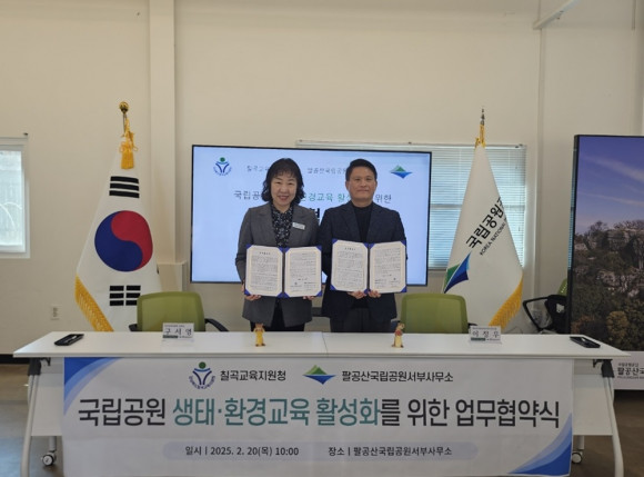 |  | | | ⓒ (주)영남도민일보 | | [영남도민일보] 영남도민일보 기자 = 국립공원공단 팔공산국립공원서부사무소(소장 이정우)는 2월 20일, 경상북도칠곡교육지원청(교육장 구서영)과 생태·환경교육 활성화와 지속가능한 교육 협력체계 구축을 위한 업무협약(MOU)을 체결했다고 밝혔다.
