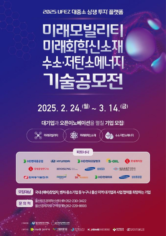 |  | | | ↑↑ 2025 UFEZ 대중소 상생 투자 플랫폼 공모전 포스터(안) | | ⓒ (주)영남도민일보 | | [영남도민일보] 영남도민일보 기자 = 울산경제자유구역청(이하 울산경자청)은 ‘2025년 울산경제자유구역(UFEZ) 대중소 상생 투자 기반(플랫폼) 공모전’을 개최한다고 밝혔다.