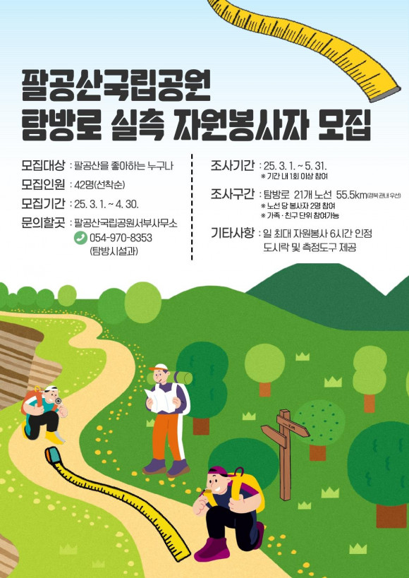 |  | | | ⓒ (주)영남도민일보 | | [영남도민일보] 영남도민일보기자 = 국립공원공단 팔공산국립공원서부사무소(소장 이정우)는 국립공원 지정 1주년을 맞아 지역 시민사회가 재능기부로 공원관리에 참여할 수 있는 자원봉사 참여 프로그램으로 “팔공산국립공원 탐방로 실측 전수조사 사업”을 수립했다고 밝혔다. 이번 프로그램은 탐방로 총 43개(132.9km)에 대하여 노선의 연장, 폭, 시설물 현황조사를 실시하며 탐방로 실측 전수조사에 따라 재능기부형 자원봉사자(개인 및 단체)를 3월 1일부터 5월 31일까지 모집한다. 모집인원은 연인원 42명이며, 산을 좋아하는 누구나 지원이 가능하다. 이번 사업 내용은 안전상에 위험이 없는 탐방로에 한하여 1일 편도 4km, 왕복 8km로 전수조사를 실시하며 직원 한 사람이 팀장이 되고 자원봉사자 2명이 팀원이 된다. 또한 참여자를 대상으로 사전 워크숍을 통해 개별 임무를 부여하고, 전수조사에 필요한 각종 장비와 도시락 등을 지원할 예정이다.