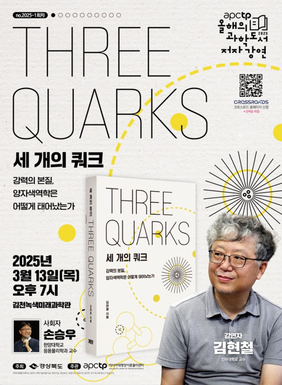 1회차 강연은 3월 13일 오후 7시, 김천녹색미래과학관 세미나실*에서 진행된다. 본 강연에서는 도서 「세 개의 쿼크」저자 김현철 교수가 물질을 이루는 가장 작은 입자인 ‘쿼크’의 역할을 중심으로 현대 물리학 근본 원리를 보다 쉽게 이해할 수 있도록 나눌 예정이다.