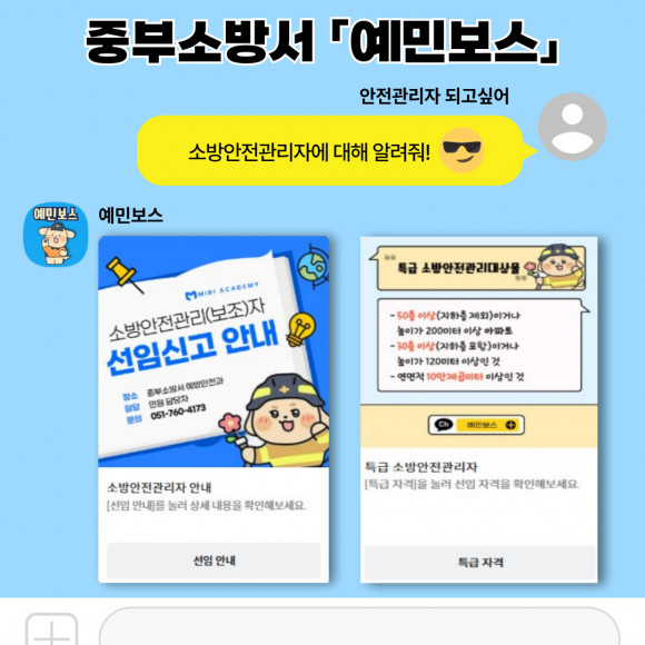 AI 챗봇 ‘예민보스’는 ▲소방안전관리(보조)자 선임 ▲소방안전관리자 교육 ▲소방안전관리대상물 ▲자체점검 등 자주 묻는 소방민원과 관련된 정보를 제공한다.