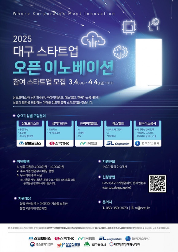 |  | | | ⓒ (주)영남도민일보 | | [영남도민일보] 김 경주 기자 = 대구광역시는 지역의 선도기업 5개사와 스타트업의 기술협력을 통한 동반성장을 지원하는 ‘2025년 대구 스타트업 오픈이노베이션 지원사업’에 참여를 희망하는 스타트업을 모집한다.