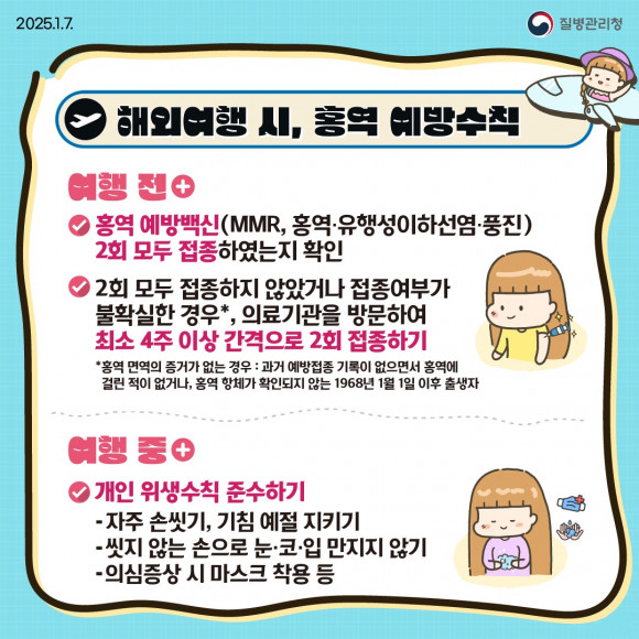 또한 입국 시 홍역 의심 증상이 나타나면 검역관에게 알리고, 여행 후 증상 시는 마스크 착용 및 타인과의 접촉을 최소화하고 의료기관을 방문하여 해외여행력을 알리고 진료를 받아야 한다.
