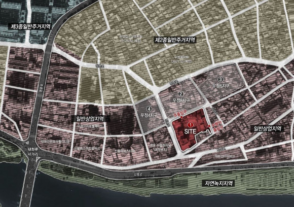 이날 심의한 안건 중 첫 번째 안건은 상업지역인 중구 우정동 상기 대지에 지하 5층, 지상 48층 2개동으로 공동주택 450세대와 오피스텔 34호를 공급하는 주상복합 공동주택 건립 사업이다.