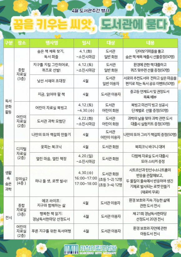 사천시립도서관 관계자는 “이번 4월 독서문화행사로 도서관을 찾는 모든 시민들이 책의 가치와 의미를 만끽할 수 있기를 바란다.”라고 전했다.