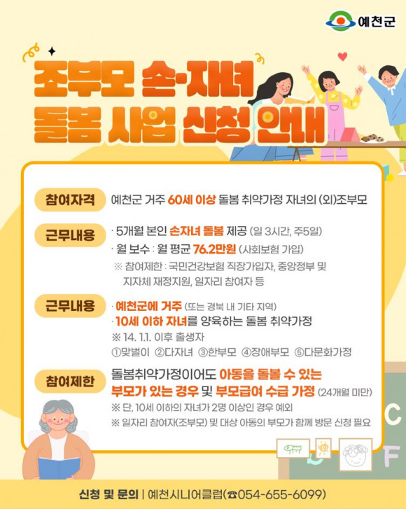 신청 대상자는 예천군에 거주하는 60세 이상 (외)조부모로, 10세 이하(’14.1.1. 이후 출생) 손자녀가 예천군 또는 경상북도 내에 거주하면서 맞벌이·다자녀·한부모 등의 사유로 돌봄이 필요한 가정일 경우 신청이 가능하다.