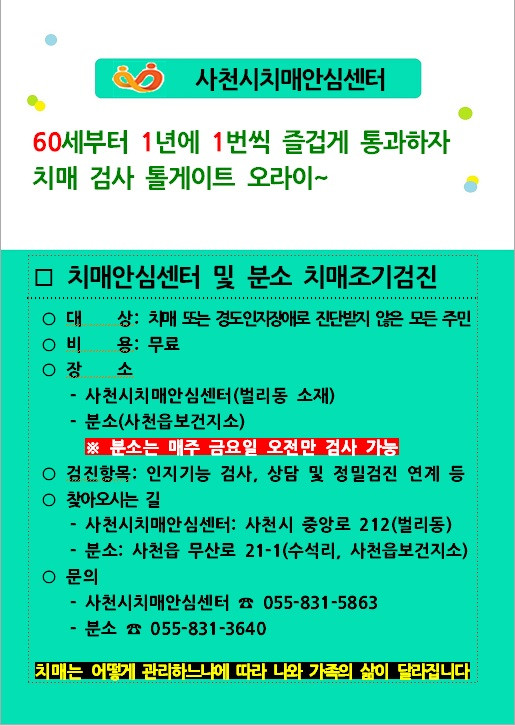 치매검진은 그동안 사천시치매안심센터(벌리동 소재)에서만 받을 수 있어 원거리 거주자나 이동이 불편한 어르신들이 어려움을 겪었다.