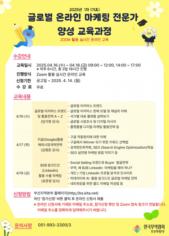 연수 과정 상세일정과 세부 강의 내용 등은 한국무역협회 부산지역본부 누리집(bs.kita.net)과 시 해외마케팅 통합시스템(trade.bepa.kr)에서 확인할 수 있다. 수강을 희망할 시, 과정별 개강 2주 전 한국무역협회 부산지역본부 누리집(bs.kita.net)을 통해 신청하면 된다. 과정별 회차당 100명을 선착순으로 모집하며 중복 신청이 가능하다.