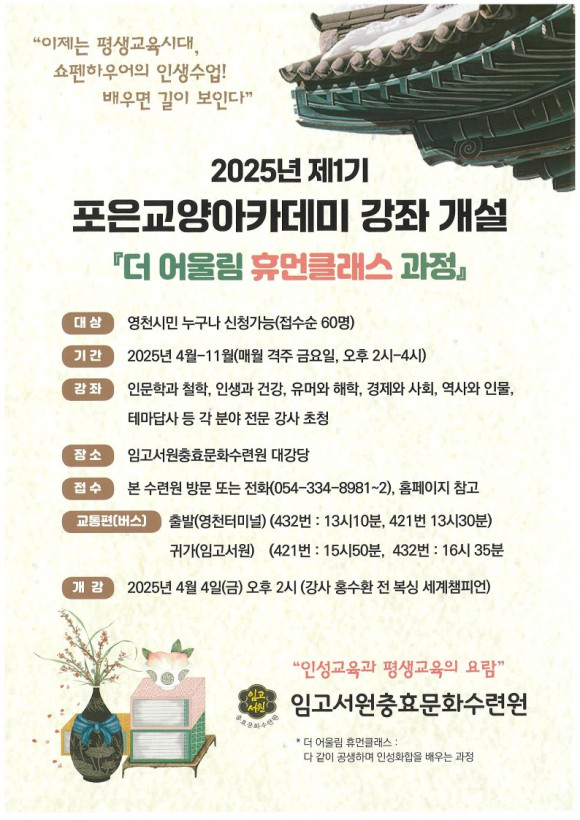 이번 과정은 영천시민을 대상으로 진행되며, 4월 4일부터 11월 7일까지 총 14회로 구성됐다. 매 강좌 1회마다 선착순 60명까지 임고서원 충효문화수련원 방문 또는 전화(☎054-334-8981~2)로 신청 접수가 가능하다.