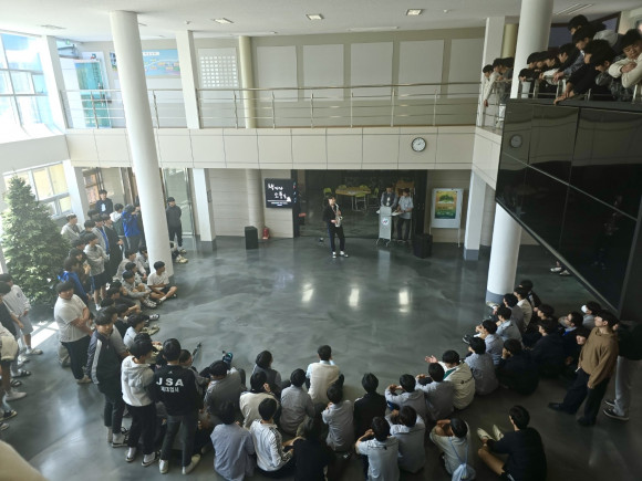 이어지는 무대는 분위기를 단숨에 반전시켰다. 3학년 학생들로 구성된 랩 공연팀이 등장하자마자 허브홀은 순식간에 환호성 가득한 공연장으로 변모했다. 특히 이날 공연은 3학년이 참여하는 마지막 공연이라 아쉬움이 교차하는 한편, 3학년을 진심으로 응원하고 격려하는 교사와 학생 모두의 마음이 고스란히 전해지는 자리였다. 섹소폰을 연주한 3학년 강한결 학생은“누군가에게 위로를 전하고 싶다는 생각에서 공연을 준비했는데, 진심으로 공감해주는 관객들의 모습에서 오히려 내가 위로받을 수 있었다.”라고 전했다. 행사 진행을 맡은 2학년 학생부회장 황지성 학생은 “준비 단계부터 공연 당일까지 전 과정을 학생들이 주도했다는 점에서 뿌듯함을 느낀다.”라며 “앞으로도 학생들에게 이런 휴식 같은 시간을 만들어주고 싶다.”라고 밝혔다. 이번 공연은 예술이 갖는 소통의 힘과 학생들 스스로 만들어가는 학교 문화의 가치를 새삼 일깨워주는 자리였다.