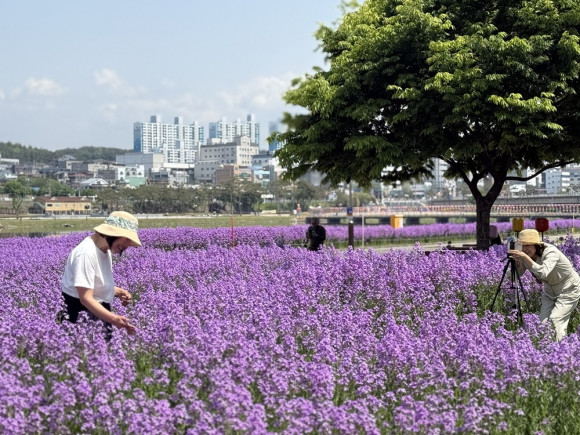 |  | | | ↑↑ 방문객들이 영천강변공원에 조성된 보라유채꽃밭의 경치를 감상하고 있다. | | ⓒ (주)영남도민일보 | | [영남도민일보] 박 성모 기자 = 영천시의 봄이 짜릿한 보랏빛으로 물들었다.