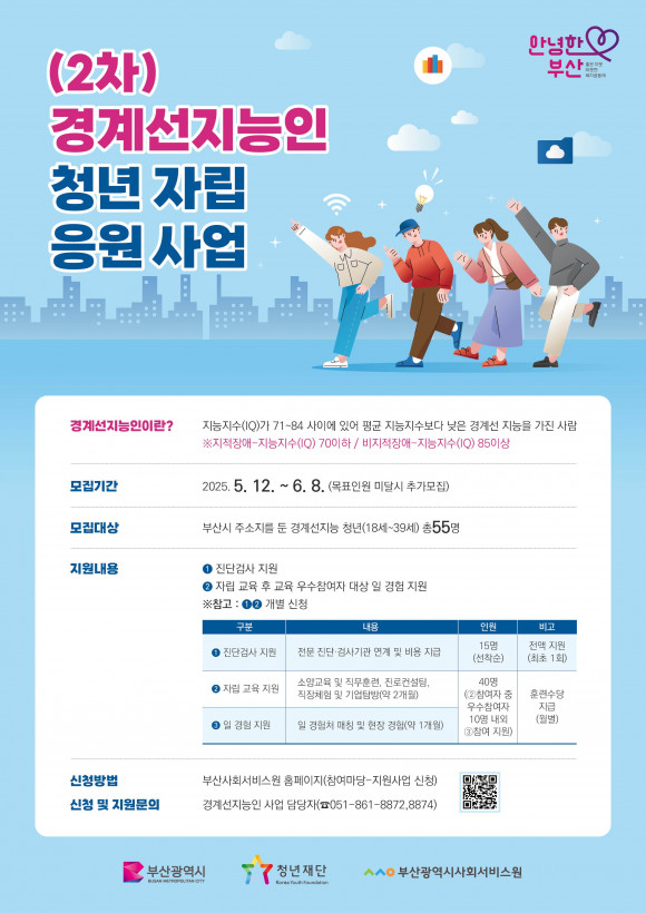 |  | | | ↑↑ 2차 경계선지능인 청년 자립 응원 사업 홍보 포스터. | | ⓒ (주)영남도민일보 | | [영남도민일보] 영남도민일보 기자 = 부산사회서비스원(원장 유규원)은 장애에 해당하진 않지만 지능지수가 71~84 사이의 제도적 사각지대에 놓인 ‘경계선지능인’의 사회적 지원을 위한 청년 자립 응원 사업 2차 대상자를 다음 달 8일까지 모집한다.