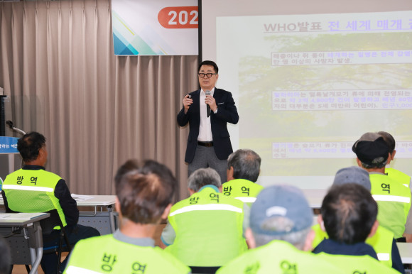 본격 방역에 앞서 예천군은 4일, 읍‧면 방역 담당자 및 방역 인부 30여 명을 대상으로 체계적인 방역소독 방법, GIS(방제지리정보시스템) 활용법, 안전보건 교육 등을 실시해 현장 대응 역량을 강화했다.