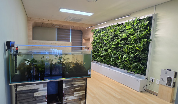 수직정원은 높이 약 2.3m, 길이 약 3m 규모의 지능형정원(스마트가든)으로 조성됐다. 자동 관수·조명 체계(시스템)를 갖춰 공기 정화와 스트레스 완화, 실내 습도 조절 등 환경 개선 효과를 제공한다.