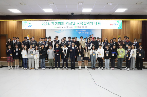 |  | | | ⓒ (주)영남도민일보 | | [영남도민일보] 영남도민일보 기자 = 경상남도교육청(교육감 박종훈)은 15일(월) 본청 본관 2층 강당에서 18개 시군 학생의회 의장단 62명과 함께 '2025년 학생의회 의장단 교육감과의 대화'를 열었다.