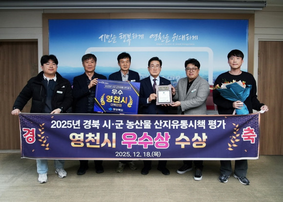 |  | | | ↑↑ 수상 기념 촬영 사진 | | ⓒ (주)영남도민일보 | | [영남도민일보] 박 성모 기자 = 영천시는 지난 18일 경주에서 열린 농산물 산지유통 총괄평가회에서 ‘2025년 경상북도 시·군 농산물 산지유통시책 평가’ 우수상을 수상했다고 밝혔다.