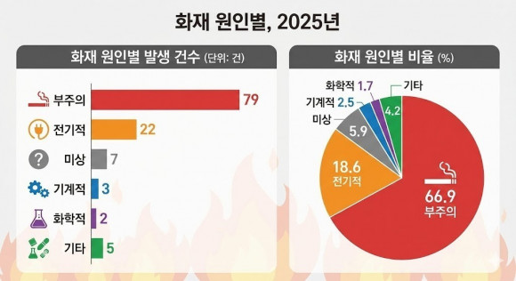 화재 발생 원인으로는 부주의가 79건(66.9%)으로 압도적으로 높았으며, 전기적 요인 22건(18.6%), 원인 미상 7건(5.9%)이 그 뒤를 이었다.