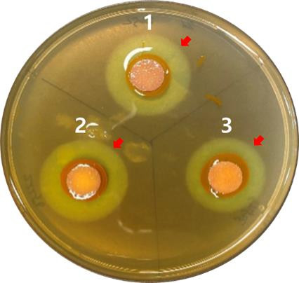 |  | | | ↑↑ 염색 시약 반응 결과, 신종 미생물(1번)이 대조군 미생물(2, 3번)과 동일하게 알긴산을 분해하여 주변에 선명한 분해환(Clearance zone, 화살표 표시)이 형성된 것을 확인할 수 있다. | | ⓒ (주)영남도민일보 | | [영남도민일보] 영남도민일보 기자 = 국립해양생물자원관은 충남 태안 갯벌에서 해조류 성분인 알긴산을 분해할 수 있는 신종 해양미생물 ‘아가리보란스 세디미니스’를 발견했다고 밝혔다.