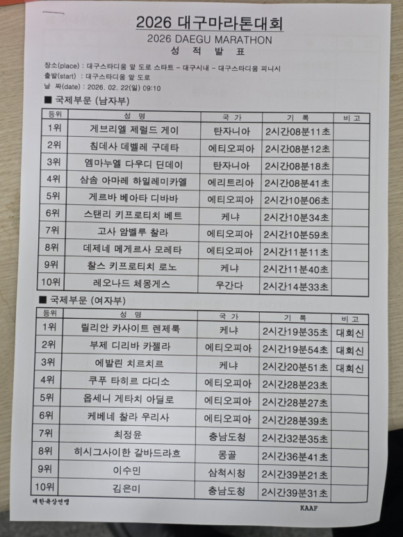 |  | | | ⓒ (주)영남도민일보 | | [영남도민일보] 김 경주 기자 = 2월 22일(일) 대구스타디움에서 열린 ‘2026 대구마라톤’이 25회째를 맞아 코스를 재정비하고 운영 완성도를 높인 가운데, 여자부 대회 신기록과 남자부 대회 2연패 기록이 동시에 탄생했다.