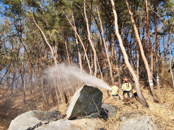 이날 소방차량을 이용해 문화유산 외곽 산림 지역에 산불지연제 3톤을 띠 형태로 사전 살포해 산불 발생 시 확산을 저지하기 위한 방어선을 구축했다.