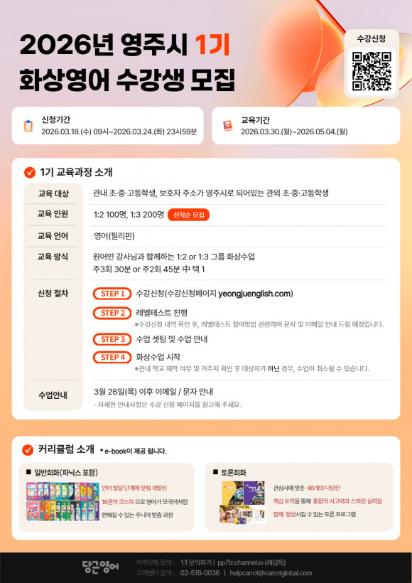 한편, 영주시 원어민 사이버 화상영어는 연간 총 5기 과정으로 운영되며 △2기는 5월 6일부터 6월 30일까지 △3기는 7월 1일부터 8월 25일까지 △4기는 8월 26일부터 10월 23일까지 △5기는 10월 26일부터 12월 18일까지 진행될 예정이다.