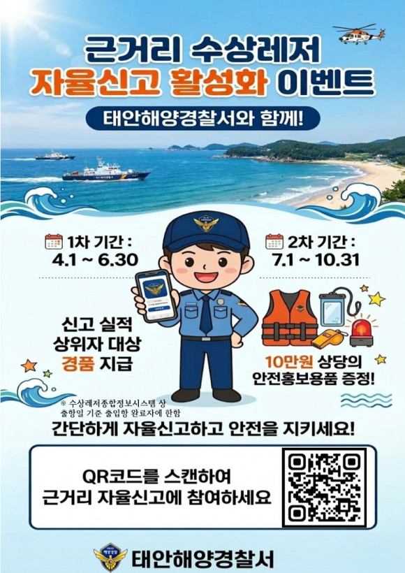이에 태안해경은 근거리 레저신고 활성화로 안전망을 확대하고 국민이 스스로 동참하는 자발적 신고 문화를 정착하기 위해 이번 이벤트를 마련했다고 밝혔다.