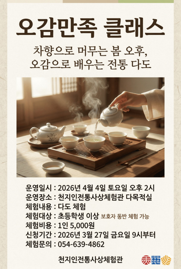 먼저 오는 4월 4일 오후 2시에는 ‘오감만족 클래스(차향으로 머무는 봄 오후, 오감으로 배우는 전통 다도)’가 진행된다.