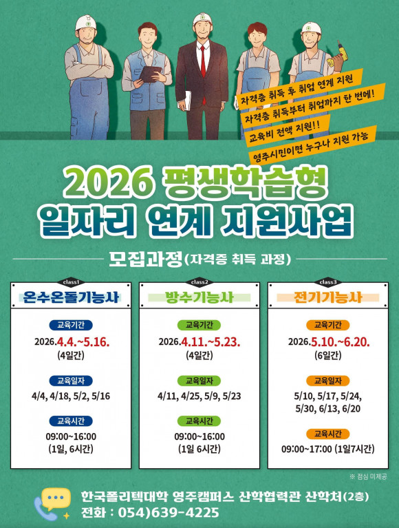 교육과정 관련 문의는 한국폴리텍대학 영주캠퍼스 산학협력관 산학처(☎054-639-4225)로 하면 된다.