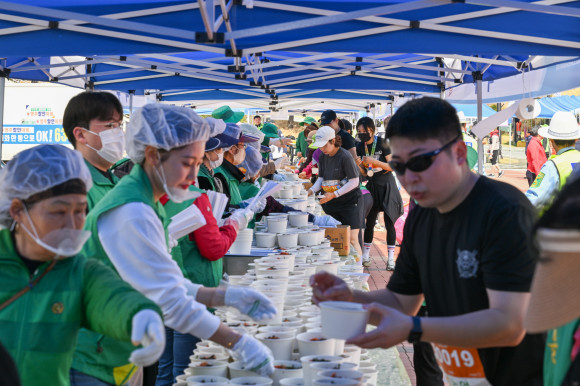 이날 새마을지도자와 부녀회장 50여 명은 이른 아침부터 대회 참가자와 관광객, 시민 등 약 1만여 명에게 나눠줄 잔치국수를 정성껏 준비했다.