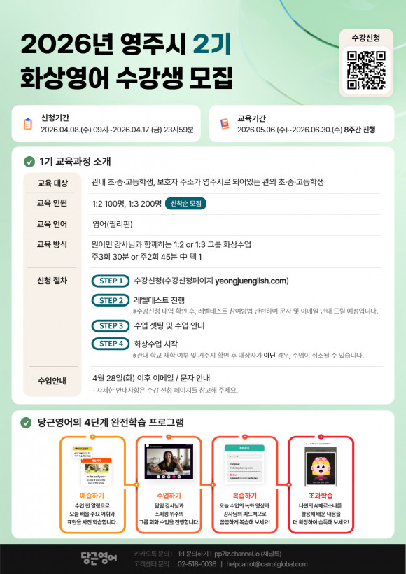 |  | | | ⓒ (주)영남도민일보 | | [영남도민일보] 김 창기 기자 = 영주시는 4월 8일부터 17일까지 ‘2026년 원어민 사이버 화상영어’ 제2기 수강생을 선착순으로 모집한다.