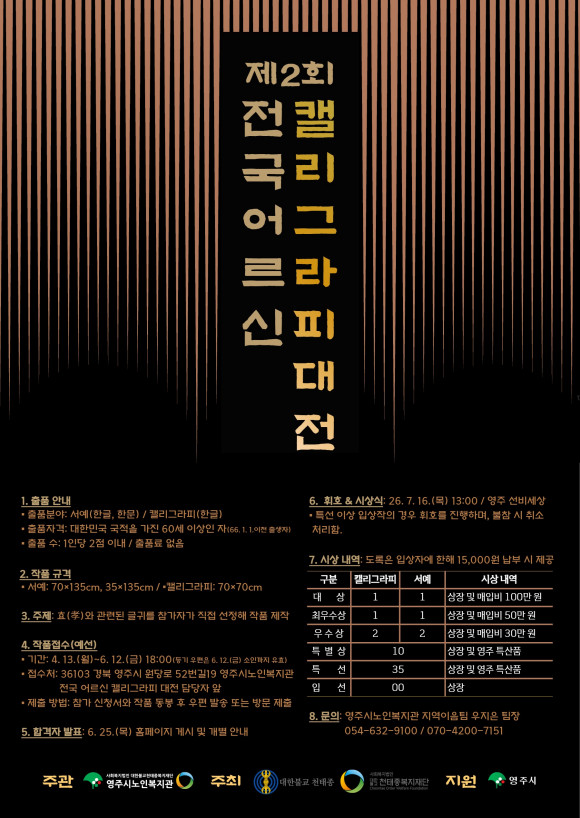 영주시노인복지관 이상규 관장은 “효의 가치를 현대적으로 재해석한 다양한 작품이 출품되길 기대한다”며 “어르신들의 삶의 깊이와 품격이 담긴 뜻깊은 대회가 될 수 있도록 많은 관심과 참여를 바란다”고 전했다.