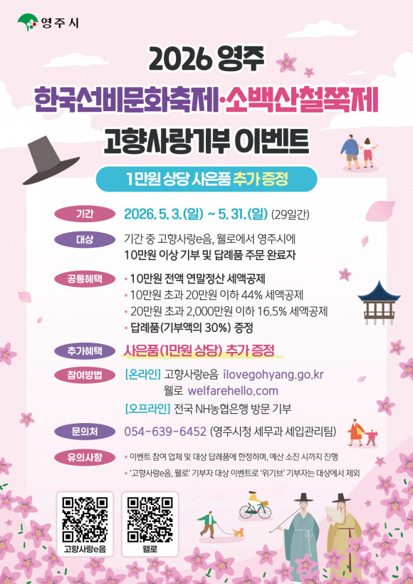 조종근 세무과장은 “이번 행사는 한국선비문화축제와 소백산철쭉제가 함께 열리는 시기에 맞춰 진행되는 만큼, 영주의 문화·관광 자원을 널리 알리고 고향사랑기부제 참여를 확대하는 계기가 될 것으로 기대한다”며 “축제 기간을 맞아 많은 분들이 영주에 따뜻한 마음을 전해주시길 바란다”고 말했다.