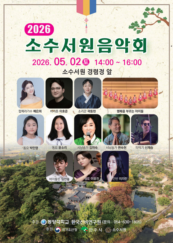 한편, ‘2026 영주 한국선비문화축제’는 5월 2일부터 5일까지 나흘간 순흥면 소수서원과 선비촌, 선비세상 등 일원에서 개최되며, 전통문화 체험과 공연, 어린이 선비축제 등 다양한 프로그램이 함께 운영될 예정이다.