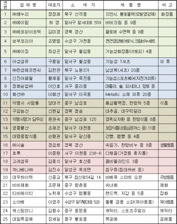 ※ 참고사항 1. 참가기업 현황 : 25개사【붙임 참고】 2. 평가참가 기관(업체) : 4개 기관, 7개 유통업체 대구상공회의소, 대구경북디자인센터, 중소기업진흥공단, 대구테크노파크, 롯데백화점, 이랜드리테일, 현대백화점, 롯데마트, 이마트, 코스트코홀세일, 홈플러스