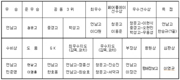 최우수상에는 언남고등학교의 이다원선수를 비롯하여 페어플레이상수비상, GK상, 도움상, 우수선수상, 득점상, 지도감독 및 코치상 등 단체 및 개인 시상자로 선정되었다.
