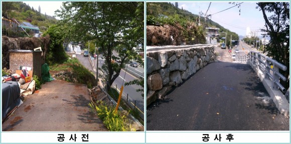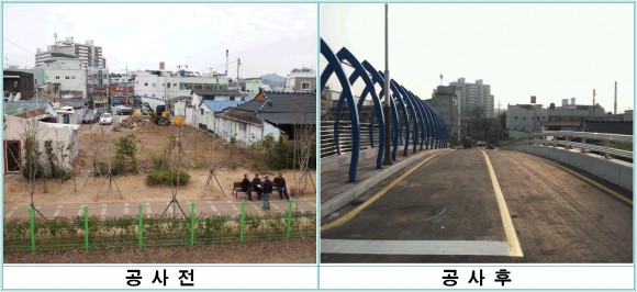 < 노산동4통~LG자이아파트간 교량설치공사 > Ⅰ사 업 개 요 -위 치 : 마산합포구 교원동 53-53번지 일원 -사업개요 : 도로개설 L=100m(교량설치L=25m), B=10.0m -사 업 비 : 1,500백만원(보상비 250백만원, 공사비 1,250백만원) -사업기간 : 2012. 10. 10 ~ 2013. 8. 28 Ⅱ그간 추진현황 - 2011. 9월 : 도시계획시설 변경 결정 및 실시설계 완료 -2012. 9월 : 편입토지(3필지) 보상완료 -2012. 10월 : 공사 착공 - 2012. 12월 : 지장건물(3동) 철거완료 - 2013. 8월 : 공사 준공 Ⅲ사 업 효 과 -임항선 철도로 단절된 지역간 도로 연결로 인근 주민들의 통행불편해소 및 대단위아파트로 인해 발생한 교통체증 해소 Ⅳ공사 전・후 사진
