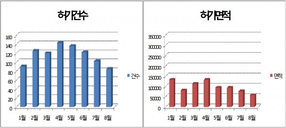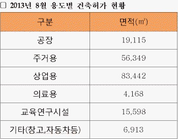 2013년 1월에는 4만 6933㎡에 불과하던 건축허가면적이 지속적으로 증가해 가장 많은 7월에는 34만 1614㎡로 1월 대비 무려 7.2배가 증가되기도 했다. 다만 8월에는 건축면적이 18만 5585㎡로 다소 줄었지만 휴가철 등을 고려하면 평균 이상의 허가규모이다.